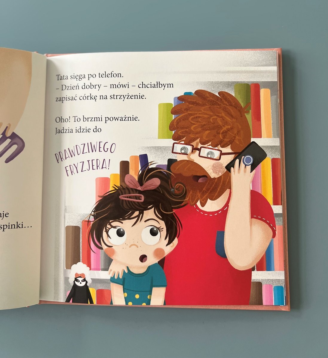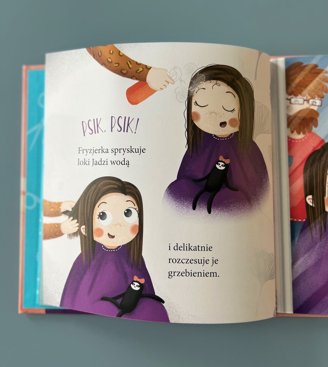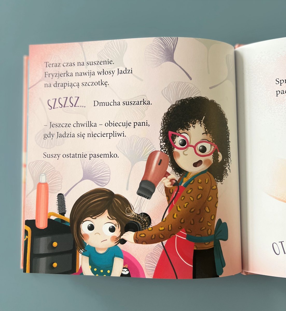 Włosy Jadzi znów urosły! Grzywka wpada do oczu i przeszkadza w zabawie. Dotychczas to mama podcinała niesforne loki, ale przyszedł czas na pierwszą wizytę u fryzjera. Czy Jadzi spodoba się nowa fryzura?