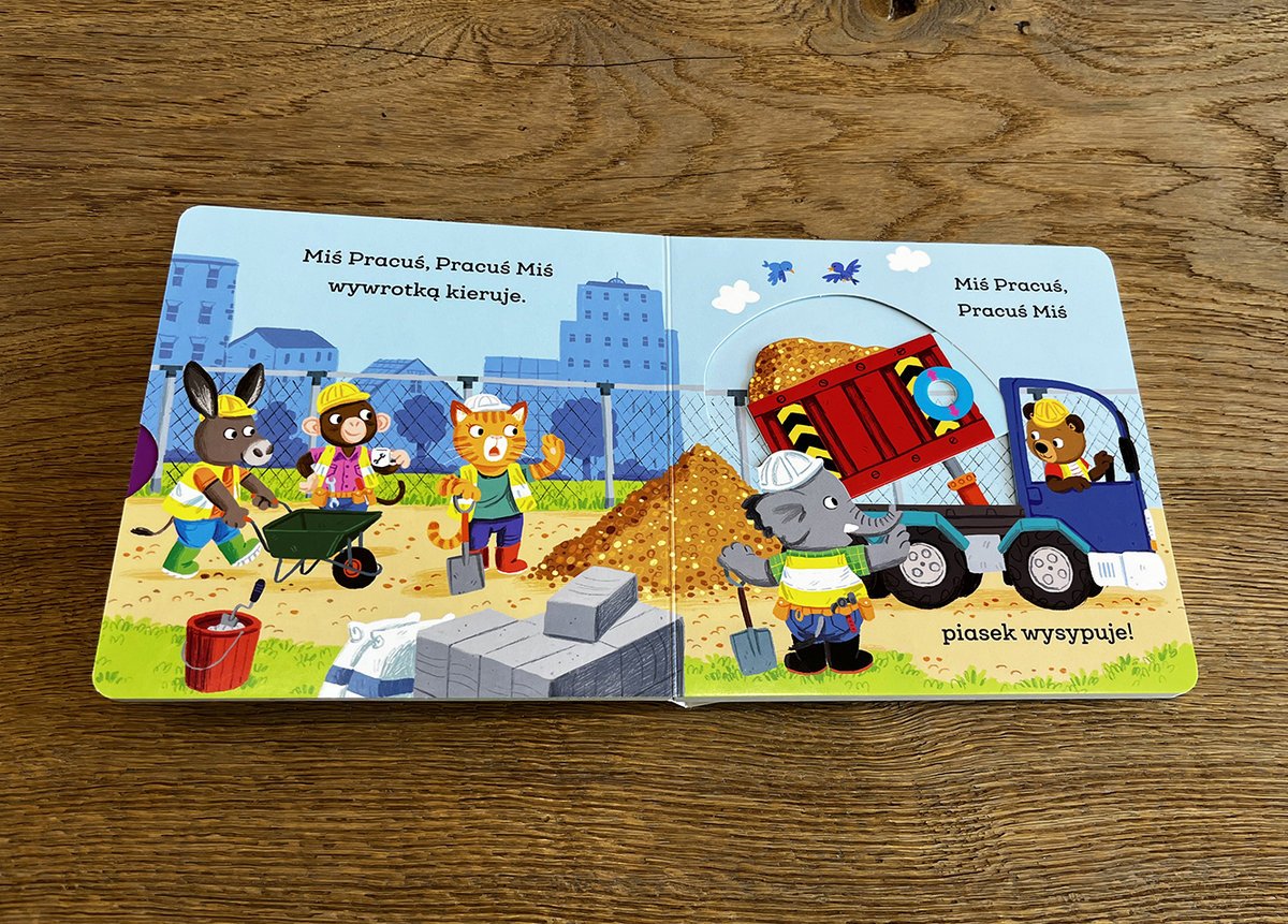 Miś Pracuś, Pracuś Miś nowe zadanie będzie miał dziś! Przesuń ruchome elementy, odkryj kryjące się w książce niespodzianki i zobacz, czym zajmuje się majsterkowicz.