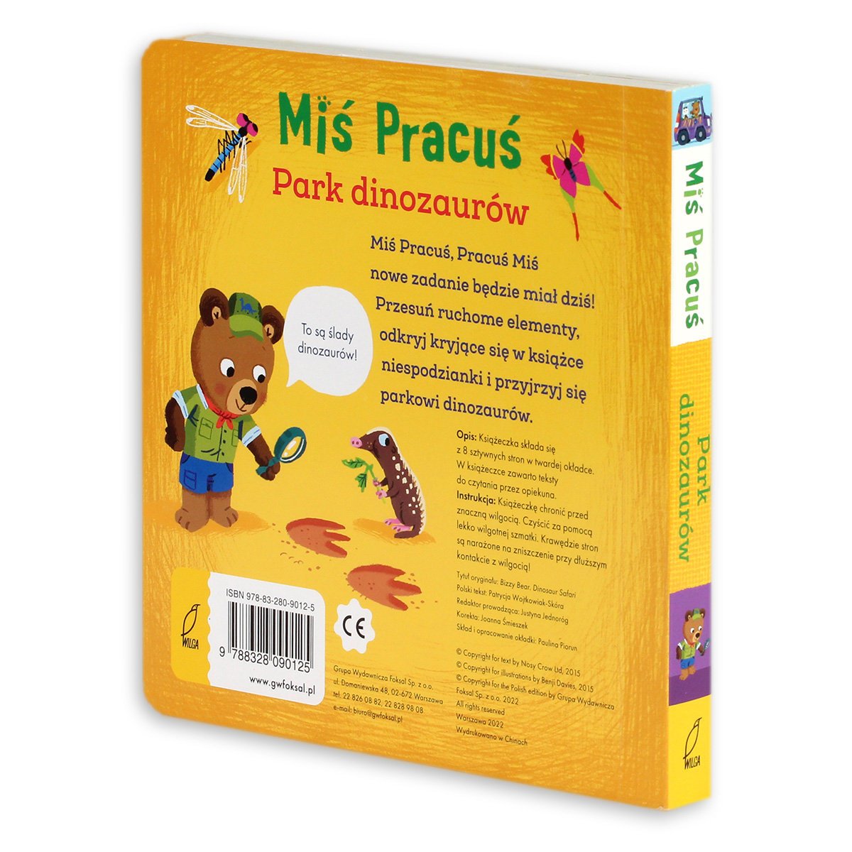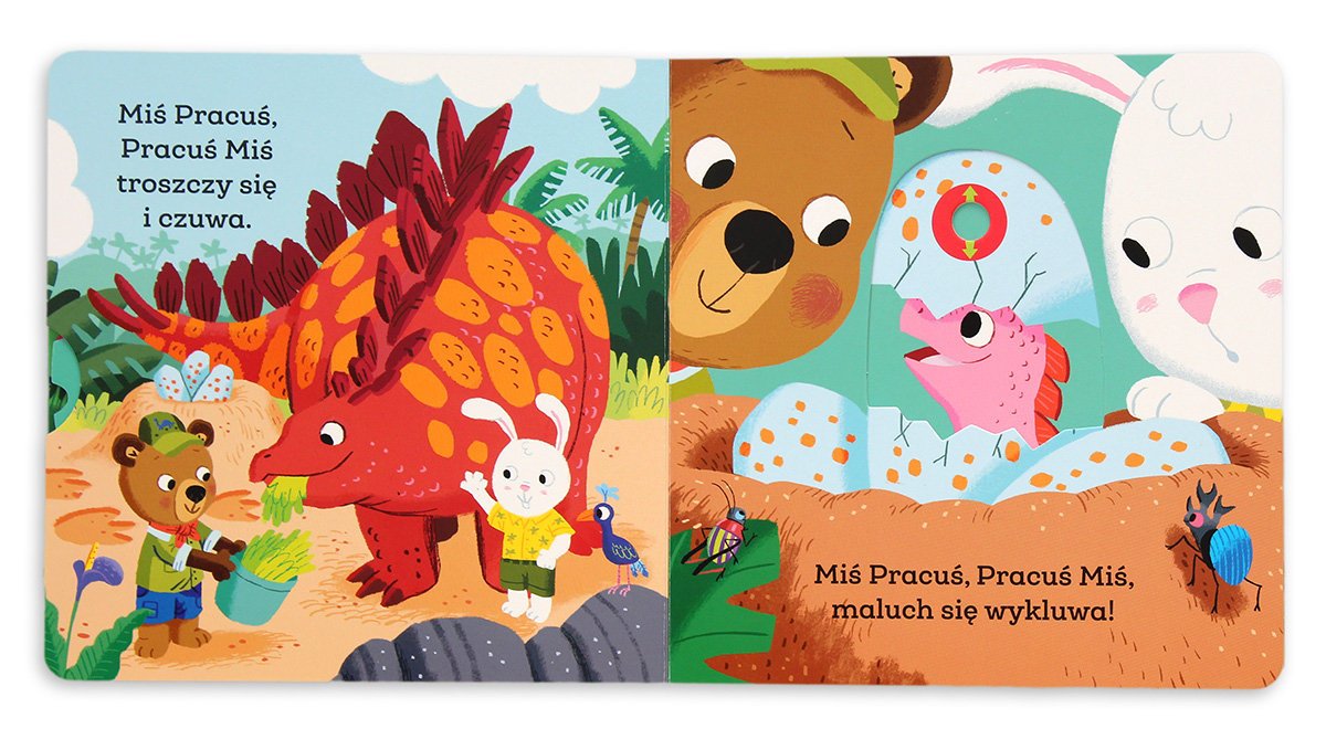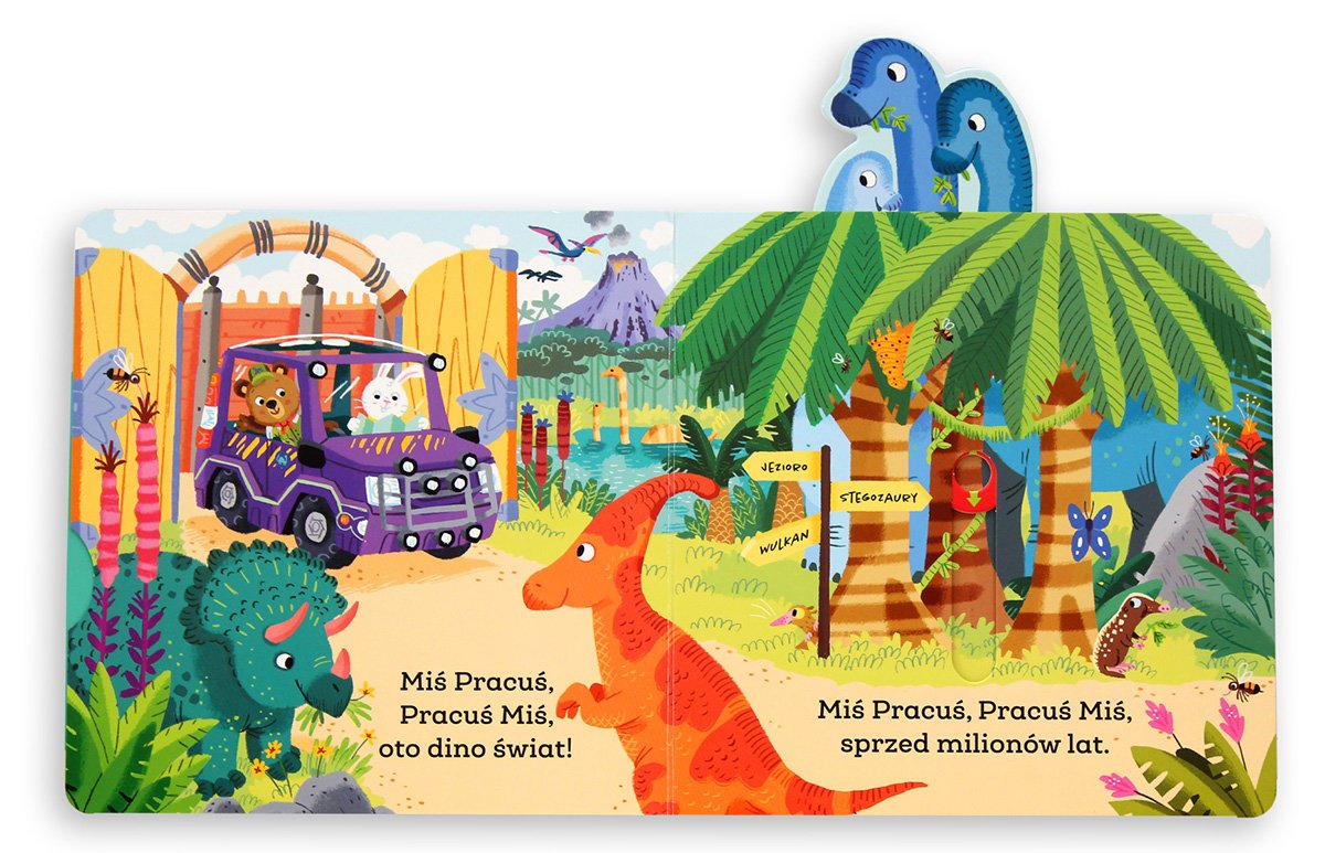 Miś Pracuś, Pracuś Miś nowe zadanie będzie miał dziś! Przesuń ruchome elementy, odkryj kryjące się w książce niespodzianki i przyjrzyj się parkowi dinozaurów.