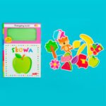 Idealny zestaw dla maluchów. W pudełku znajduje się książeczka ucząca pierwszych słów. Każda rozkładówka przedstawia wyrazy dotyczące jednej tematyki: np. owoce. Dodatkowo dzieci muszą dopasować puzzle do miejsc na stronie, co jest świetną zabawą, a dodatkowo utrwala słówka.