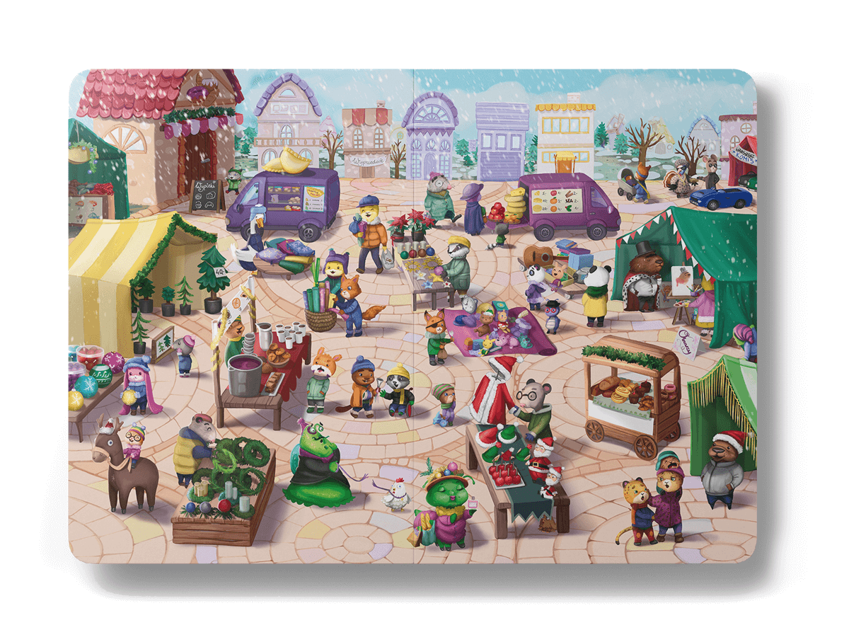 W dużej kartonowej WYSZUKIWANCE znajdziecie 12 rozkładówek pełnych szczegółów i ukrytych niespodzianek (nie tylko dla dzieci…😏). Możecie ją oglądać godzinami, ćwicząc spostrzegawczość, bawiąc się i wymyślając własne historie.