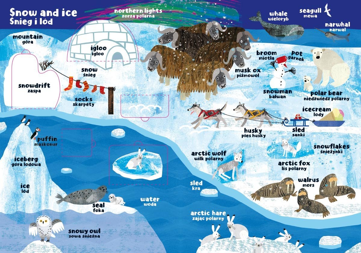 „Moja pierwsza encyklopedia polsko-angielska z okienkami” to seria edukacyjna, dzięki której najmłodsi poznają świat i uczą się angielskich słówek. W tej części pojawia się słownictwo związane ze światem zwierząt – w sumie ponad 200 słówek! Czytelnicy odwiedzą dom pewnego podróżnika, las, dżunglę, sawannę, zanurkują w morzu, a nawet dotrą do krainy całej pokrytej śniegiem. Na każdej rozkładówce można odszukać i otworzyć okienka (w całej książce jest ich 50), co pozwala odkrywać kolejne szczegóły i słowa.